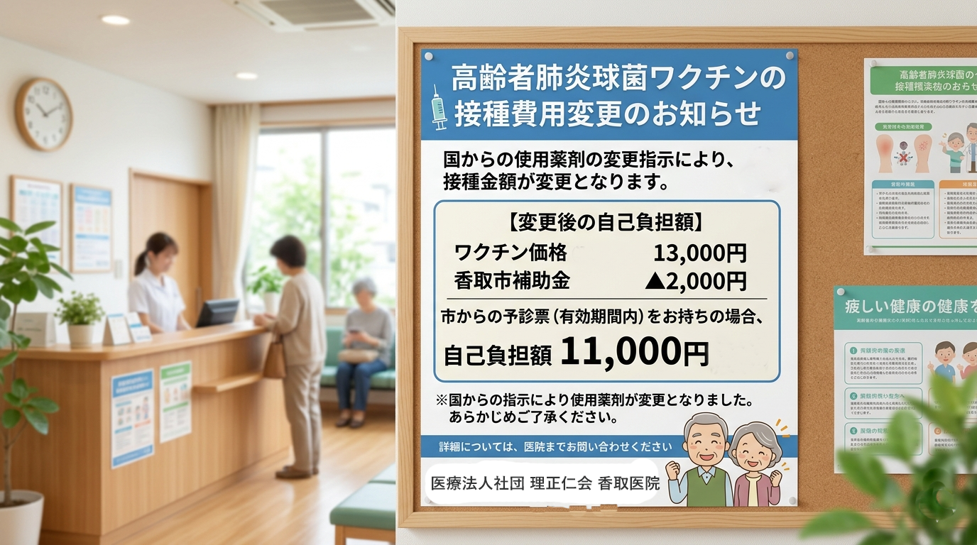 高齢者肺炎球菌ワクチンの接種金額が変更になります 2026 4/07 お知らせ 2026年4月7日 高齢者肺炎球菌ワクチンの使用薬剤の国からの変更指示により接種金額が変更になります。ワクチン価格 13,000円香取市補助金 2,000円市からの予診票(有効期間内)をお持ちの場合、自己負担 11,000円詳細については、医院までお問い合わせください 香取市で病院・診療所なら医療法人社団 理正仁会 香取医院です! お知らせ
